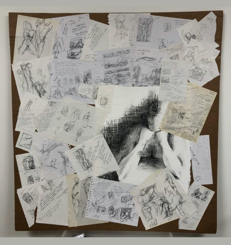 everybody has a story, sketchbook extracts, graphite on paper on cardboard, 46x48" $750.00CDN
